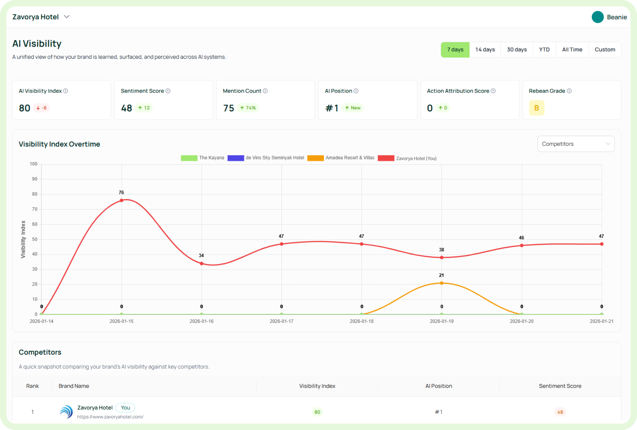 Rebean helps you understand how AI represents your brand today and where it appears in answers.